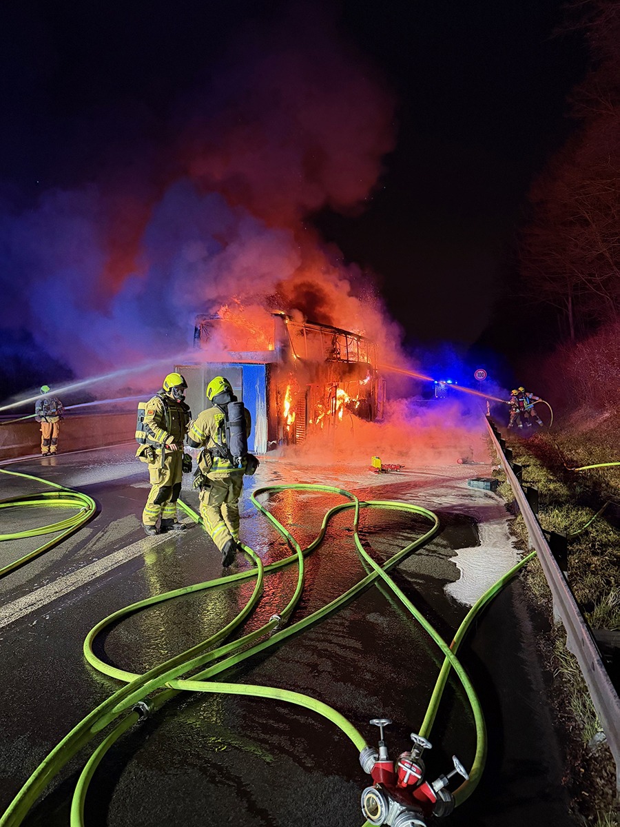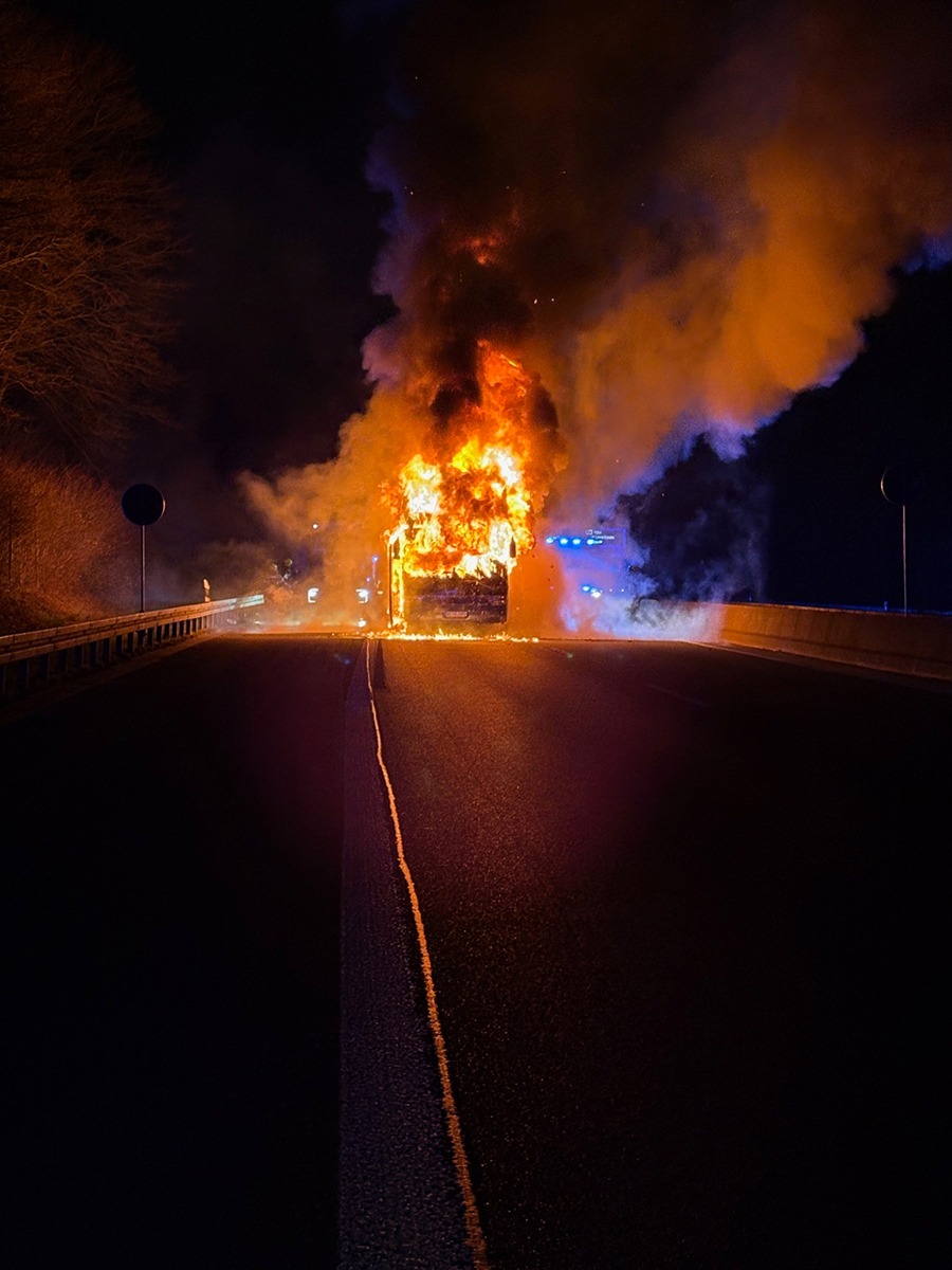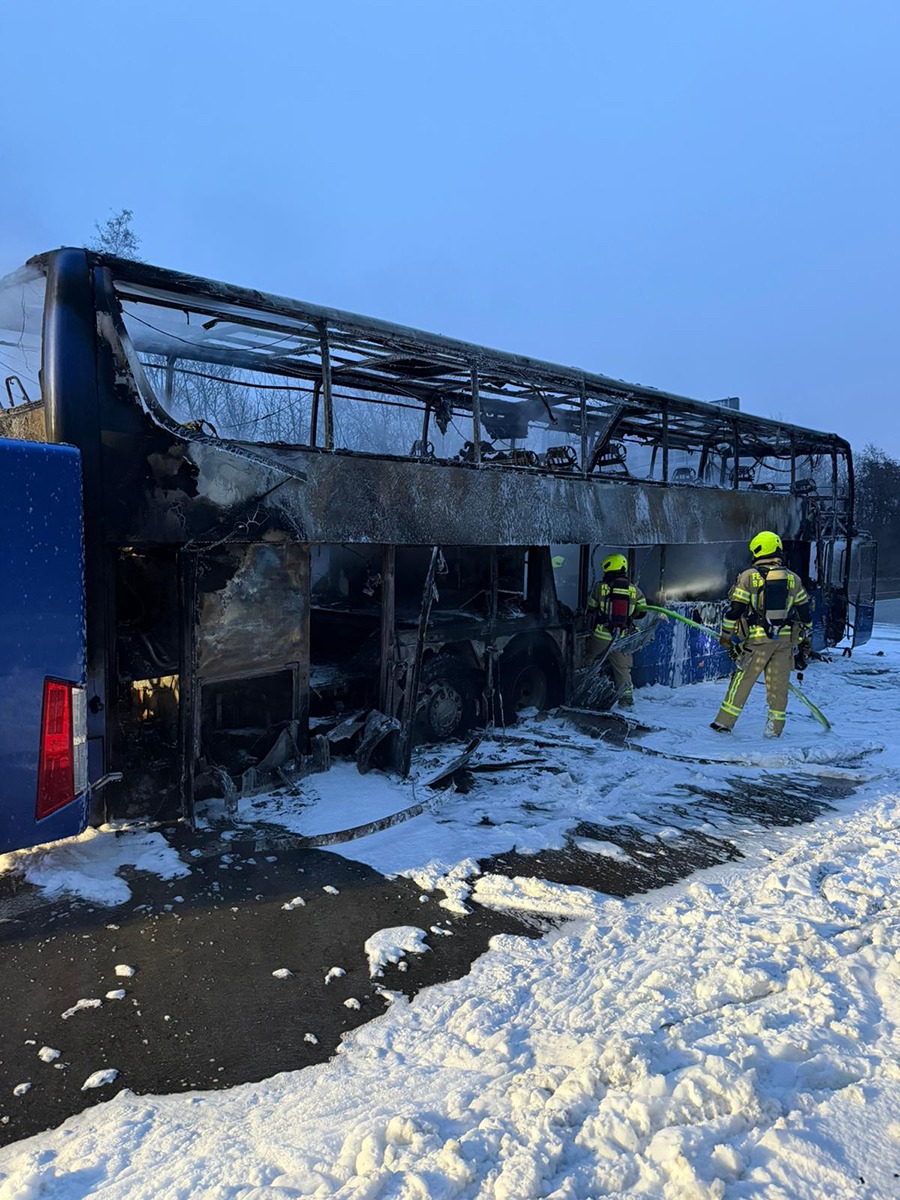 Am frühen Morgen des 6. Februar 2026 wurde die Feuerwehr zu einem Brandereignis auf die Bundesautobahn 52 alarmiert. Gegen 06:55 Uhr meldeten mehrere Anrufer einen brennenden Reisebus auf der BAB 52 in Fahrtrichtung Essen, kurz vor der Ruhrtalbrücke. Bereits auf der Anfahrt erhöhte die Leitstelle aufgrund der Vielzahl eingehender Notrufe die Alarmstufe und entsandte zusätzliche Einsatzkräfte zur Einsatzstelle. Bei Eintreffen der Feuerwehr stand ein Reisebus in Vollbrand. Unverzüglich wurde ein Löschangriff mit drei Strahlrohren eingeleitet. Aufgrund der Lage und zur Gewährleistung der Sicherheit aller Beteiligten musste die Autobahn in beide Fahrtrichtungen voll gesperrt werden. Eine besondere Herausforderung stellten die schwierigen Löschwasserbedingungen dar, weshalb verstärkt Tanklöschfahrzeuge eingesetzt wurden. Zur Brandursache kann seitens der Feuerwehr keine Aussage getroffen werden. Insgesamt waren rund 50 Einsatzkräfte der Berufsfeuerwehr sowie der Freiwilligen Feuerwehr der Standorte Mitte, Lintorf und Breitscheid im Einsatz. Unterstützt wurden sie durch den Rettungsdienst der Städte Ratingen und Heiligenhaus sowie die Autobahnpolizei. Die sieben Insassen des Reisebusses konnten das Fahrzeug selbstständig verlassen. Verletzt wurde niemand.